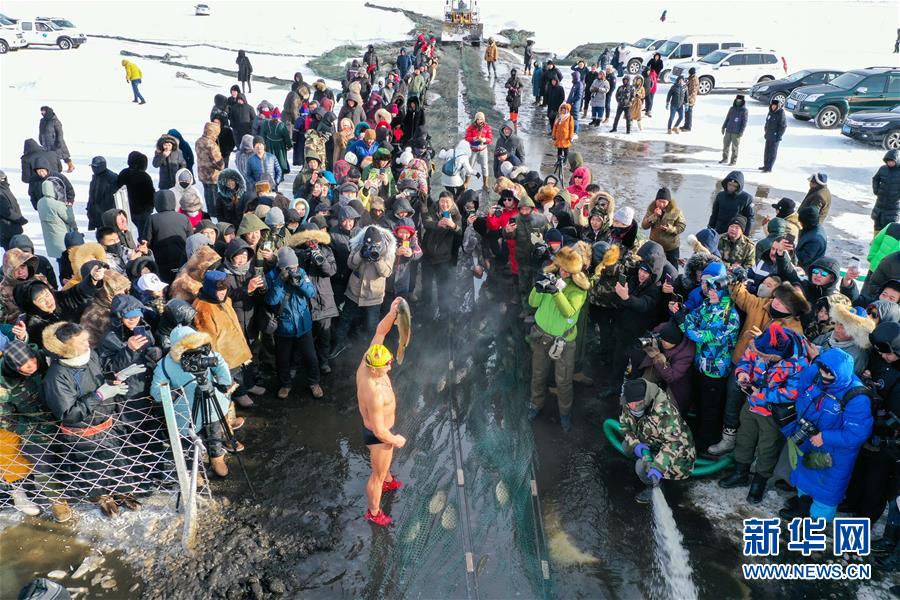 12月18日,一名冬泳愛好者展示冬捕魚(無(wú)人機(jī)拍攝)。 當(dāng)日,位于內(nèi)蒙古呼倫貝爾大草原上的諾干湖舉行冬捕活動(dòng),吸引不少游客前來(lái)觀看。冬日的諾干湖冰雪覆蓋,諾干湖冬捕也是當(dāng)?shù)囟韭糜蔚奶厣顒?dòng)之一。 新華社記者 劉磊 攝
