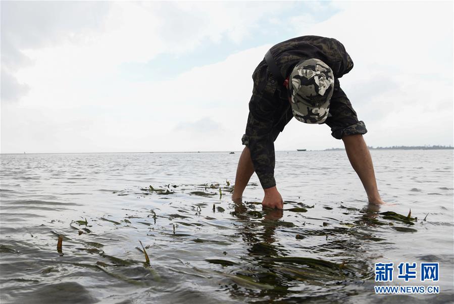 海南清瀾港省級(jí)自然保護(hù)區(qū)護(hù)林員呂詩陽在保護(hù)區(qū)內(nèi)的灘涂上查看海草情況(12月17日攝)。 新華社記者楊冠宇攝
