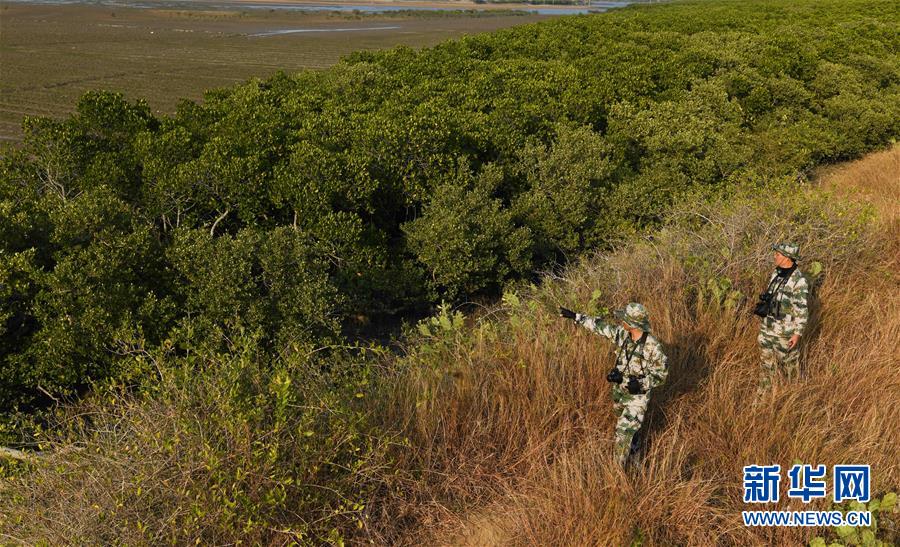海南儋州新英灣紅樹林市級(jí)自然保護(hù)區(qū)護(hù)林員陳正平(前)和同伴巡護(hù)保護(hù)區(qū)內(nèi)的紅樹林(12月9日攝)。陳正平2010年開始在保護(hù)區(qū)工作,他將工作發(fā)展成愛好,廣泛參加各種培訓(xùn)和業(yè)內(nèi)交流。他在工作中拍到瀕危鳥類白肩雕出現(xiàn)在海南的照片,這刷新了海南省的鳥種記錄。新華社記者楊冠宇攝