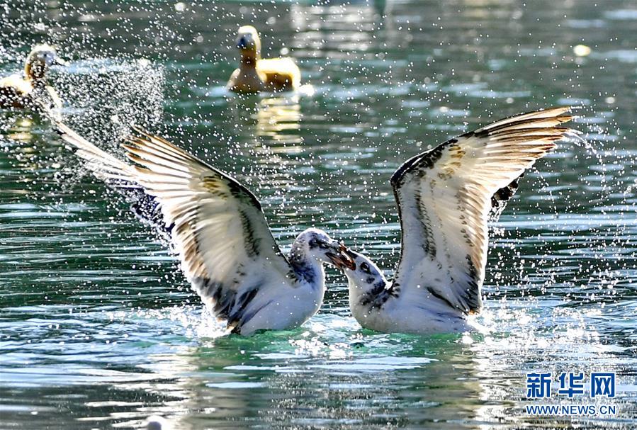 兩只紅嘴鷗在龍王潭公園的水面上爭(zhēng)食(12月20日攝)。新華社記者張汝鋒攝