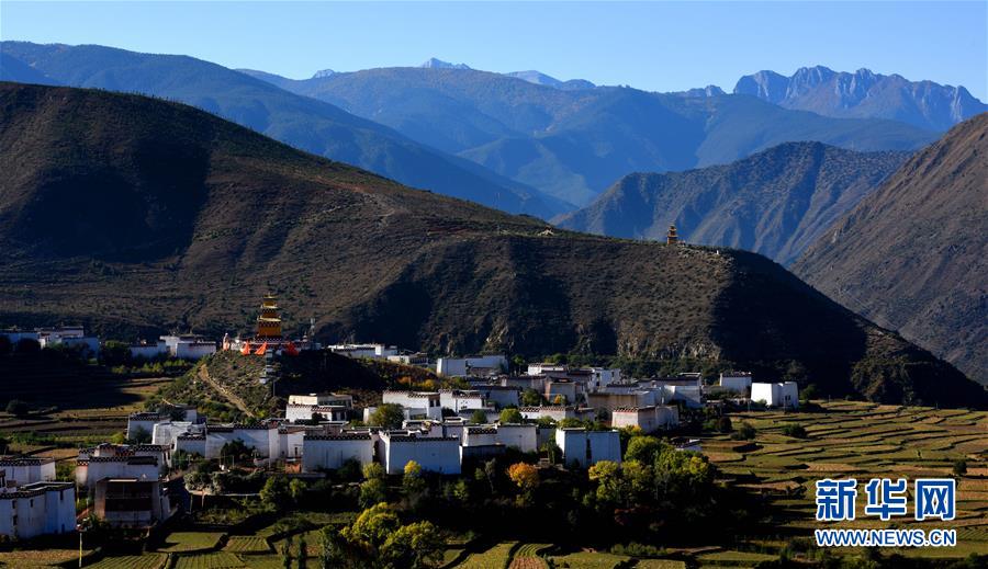川藏線四川甘孜縣境內(nèi)的雪山、白塔和民居(11月3日攝)。新華社記者陳天湖攝