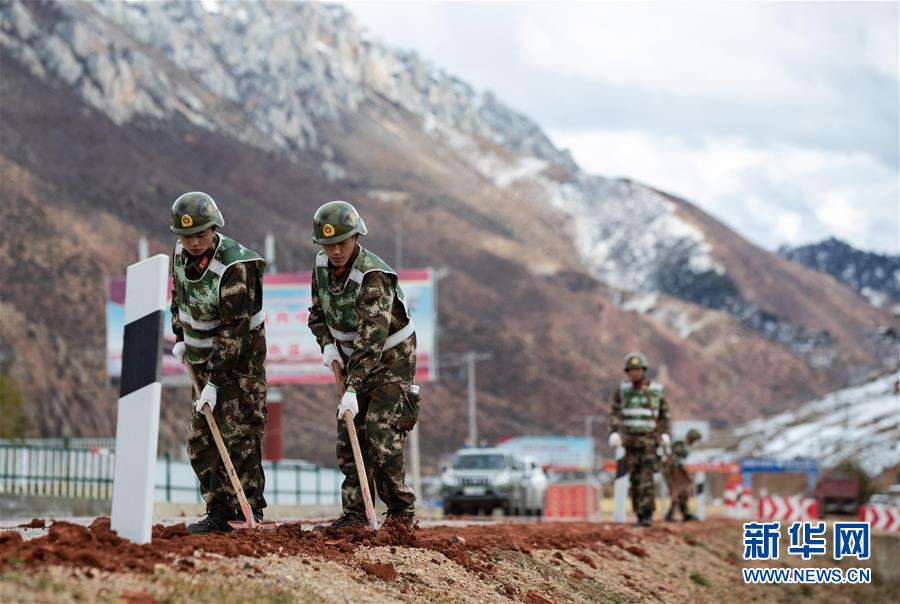 武警某部交通養(yǎng)護(hù)中隊(duì)的戰(zhàn)士在318國道八宿縣邦達(dá)鎮(zhèn)段養(yǎng)護(hù)路面(10月23日攝)。新華社記者江宏景攝