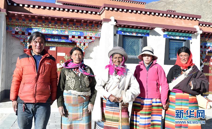 12月23日,西藏那曲市雙湖縣80歲的牧民索朗德慶(中)與親戚在新家門口。新華社記者覺果攝