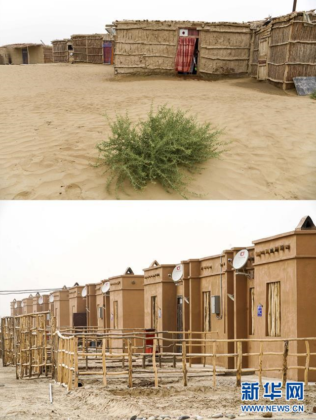 拼版照片:上圖為新疆于田縣達(dá)里雅布依鄉(xiāng)的民居(2018年9月7日攝);下圖為達(dá)里雅布依小鎮(zhèn)易地扶貧安置點(diǎn)的房屋(2019年3月20日攝)。新華社記者胡虎虎攝