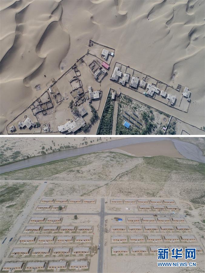 拼版照片:上圖為地處沙漠腹地的新疆于田縣達(dá)里雅布依鄉(xiāng)一處村落(2018年9月6日無人機(jī)拍攝);下圖為建設(shè)中的達(dá)里雅布依小鎮(zhèn)易地扶貧安置點(diǎn)(2018年9月8日無人機(jī)拍攝)。新華社記者胡虎虎攝