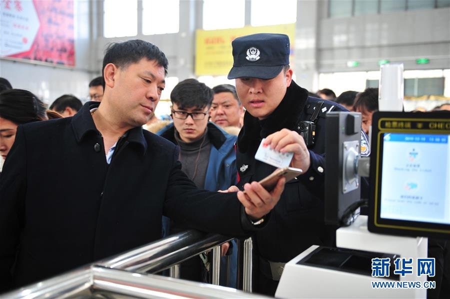 金寨火車站派出所民警呂錦鵬(前右)在檢票口執(zhí)勤(12月19日攝)。新華社記者鄧堅攝