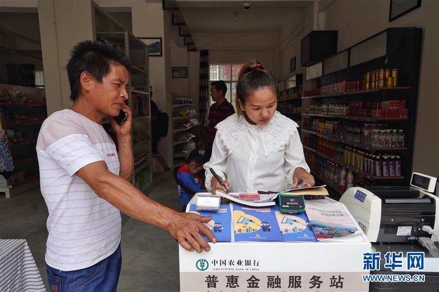 在大興地鎮(zhèn)維拉壩“珠海小區(qū)”金融服務(wù)站,姬紅花(右)幫助村民提取現(xiàn)金(6月24日攝)。新華社記者秦晴攝