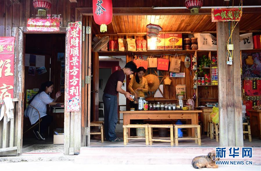 在龍巖市永定區(qū)湖坑鎮(zhèn)洪坑村土樓群游覽區(qū),土樓周邊的村民開設(shè)了農(nóng)產(chǎn)品特產(chǎn)店和飲食店來吸引游客消費(fèi)(5月4日攝)。新華社記者魏培全攝
