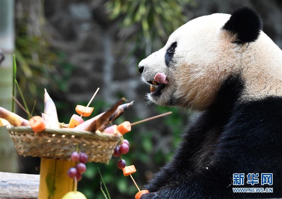 當(dāng)日是2019年最后一天,海南熱帶野生動(dòng)植物園的工作人員為園區(qū)內(nèi)大熊貓“貢貢”“舜舜”準(zhǔn)備了用葡萄、南瓜、竹筍等果蔬制作的“火鍋串串香”,讓它們用“擼串”的方式迎接新年的到來(lái)。 新華社記者 楊冠宇 攝
