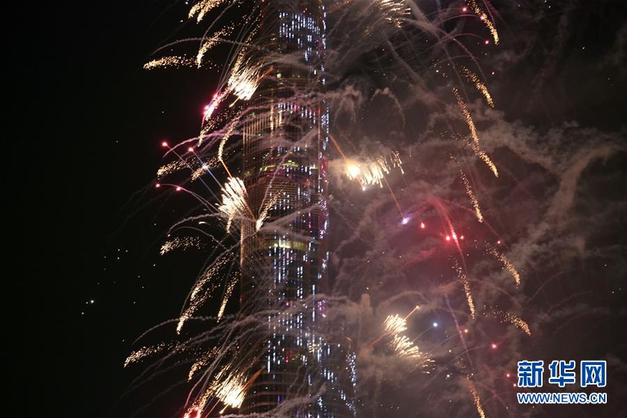 這是2020年1月1日拍攝的阿聯(lián)酋迪拜哈利法塔跨年煙火表演。新華社記者蘇小坡攝