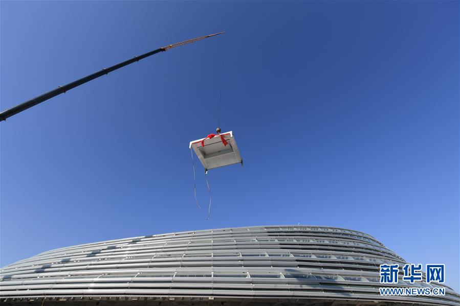 12月31日,施工人員在國家速滑館施工現(xiàn)場起吊最后一塊待安裝的屋面單元板塊。新華社記者鞠煥宗攝