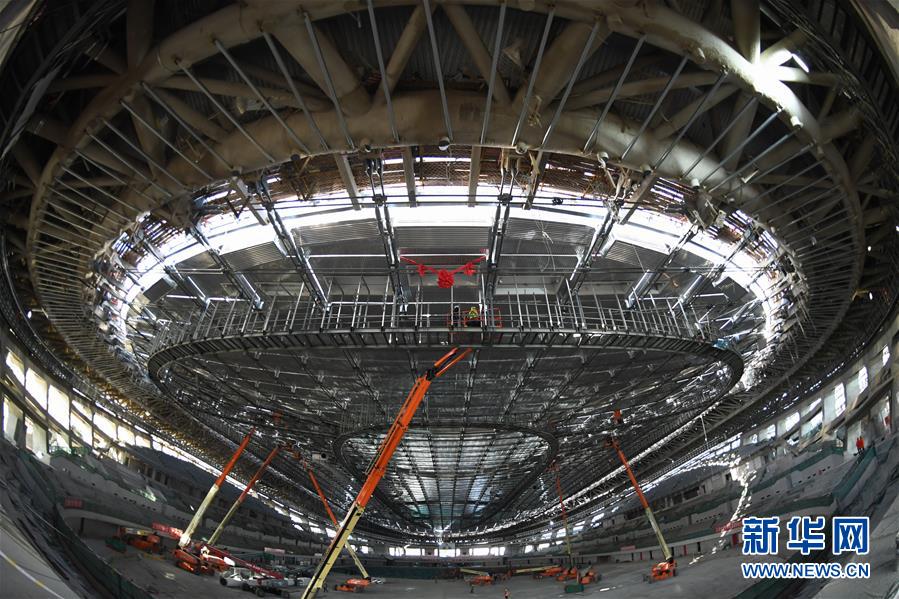 12月31日,施工人員在國家速滑館施工現(xiàn)場安裝最后一塊屋面單元板塊。新華社記者鞠煥宗攝