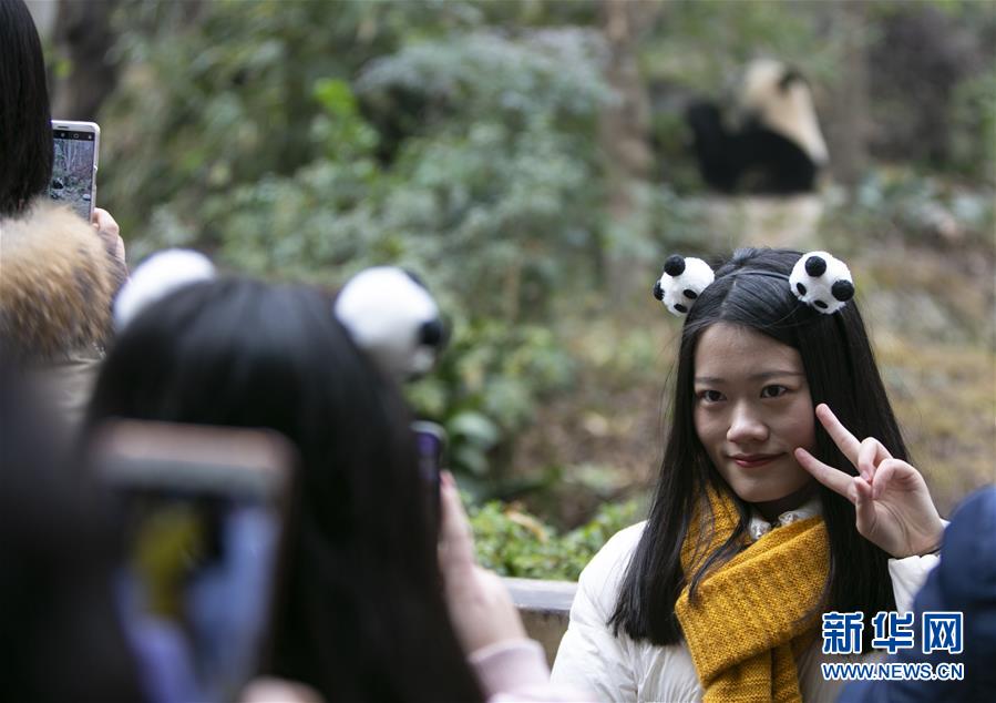 1月1日,在成都大熊貓繁育研究基地,游客在與大熊貓合影。 新華社記者 李夢(mèng)馨 攝