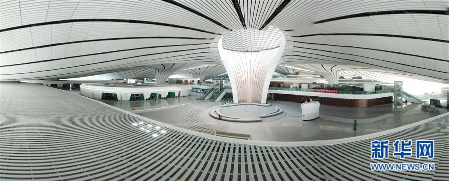 這是6月14日無人機(jī)拍攝的北京大興國際機(jī)場航站樓內(nèi)景(全景拼接照片)。新華社記者才揚(yáng)攝