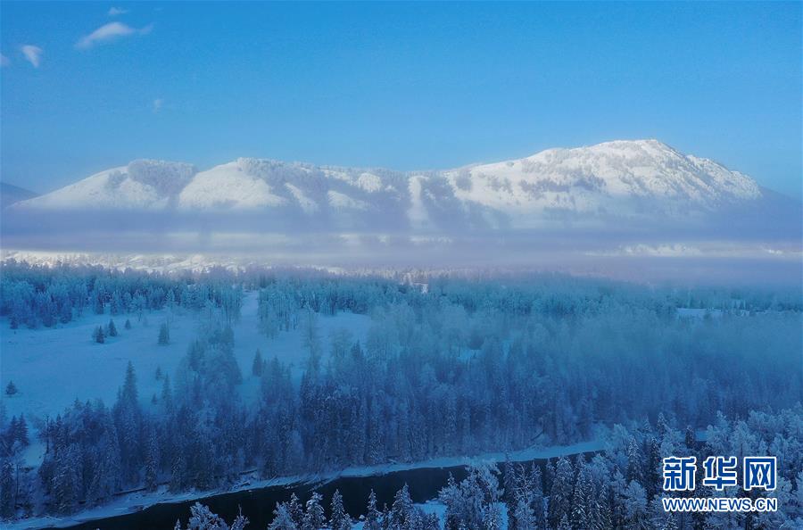 這是1月3日拍攝的喀納斯河畔的霧凇景觀(無人機照片)。