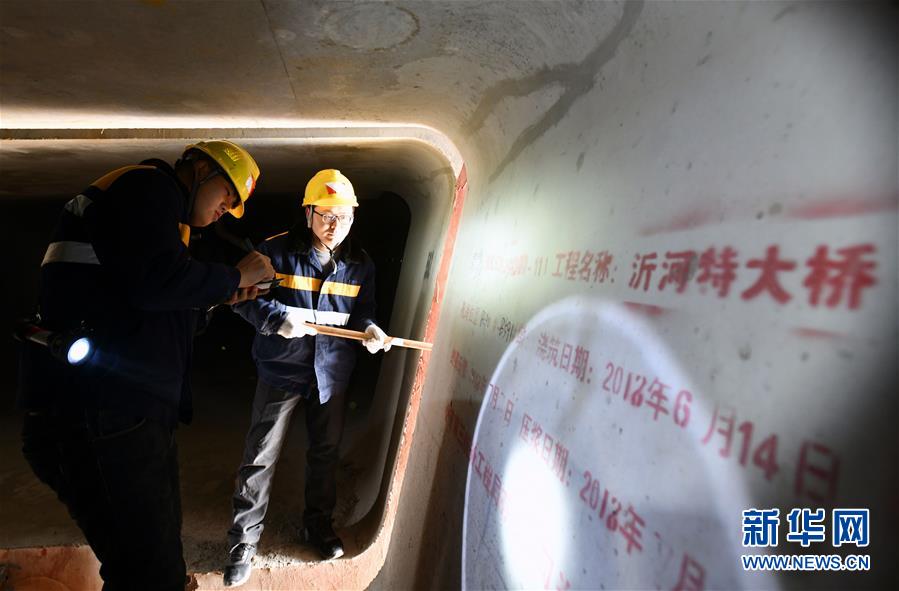 1月3日,中國鐵路濟(jì)南局臨沂工務(wù)段工程技術(shù)員在沂河特大橋箱梁內(nèi)檢查。新華社記者 朱崢攝
