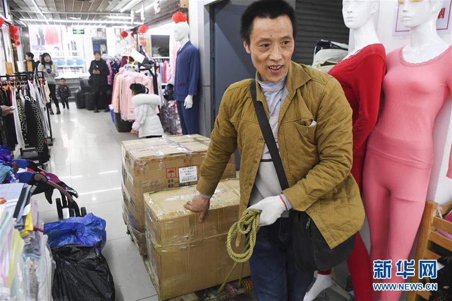 冉光輝在重慶朝天門大正商場內整理即將搬運的貨物(1月5日攝)。新華社記者王全超攝