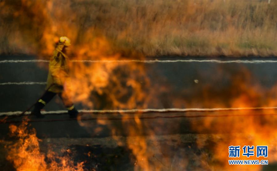 2019年11月11日,在澳大利亞新南威爾士州塔里附近的山地,消防員在撲滅山火。新華社記者白雪飛攝