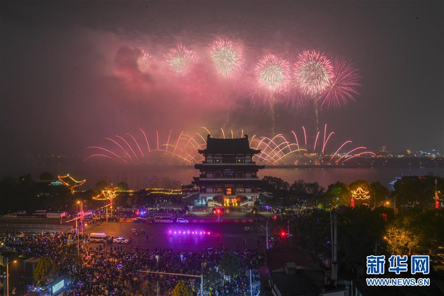 2020年1月1日晚,市民和游客在湖南長(zhǎng)沙杜甫江閣前觀看焰火晚會(huì)。 當(dāng)晚,湖南長(zhǎng)沙在橘子洲舉行音樂(lè)焰火晚會(huì)慶祝元旦,吸引眾多市民和游客前往觀看。 新華社記者 陳澤國(guó) 攝