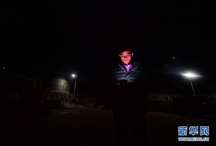 八好村駐村第一書記韋德王在去貧困戶家走訪途中查看剛剛收到的扶貧信息(1月6日攝)。新華社記者黃孝邦攝