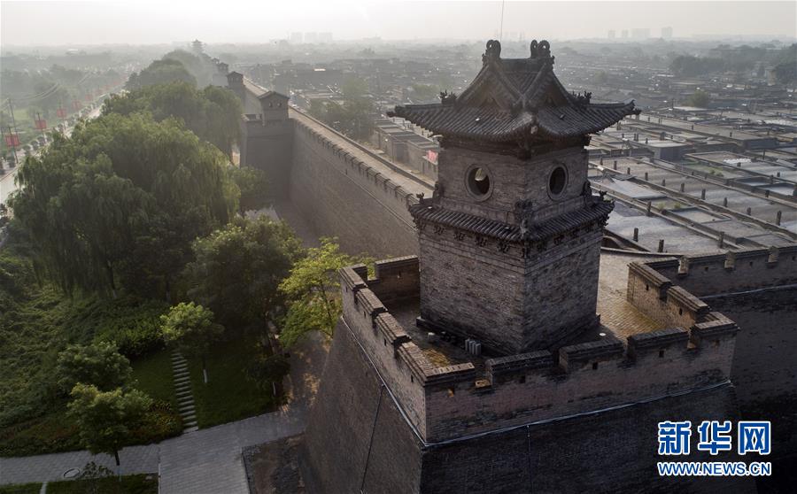 這是7月20日無人機(jī)拍攝的平遙古城墻與護(hù)城河。平遙古城城墻總周長6163米,墻高約12米,把面積約2.25平方公里的平遙縣城隔為兩個(gè)風(fēng)格迥異的世界。城墻以內(nèi)街道、鋪面、市樓保留明清形制,城墻以外為新城。