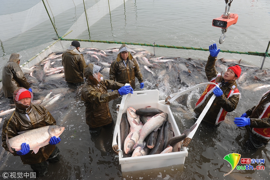 安徽阜陽:八里河冬捕魚“頭魚”拍出88萬元