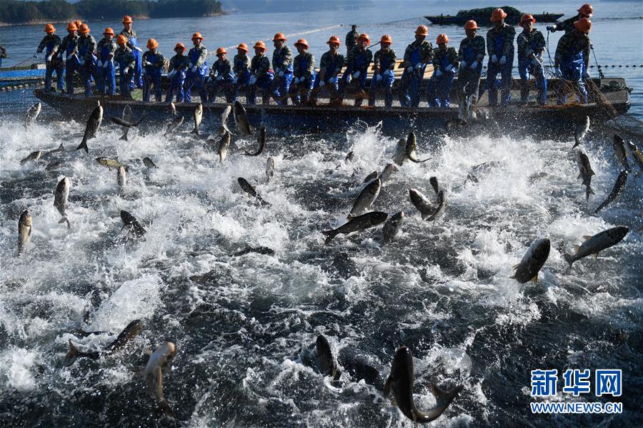 11月28日,捕撈隊(duì)員在千島湖進(jìn)行巨網(wǎng)捕魚,群魚躍出水面。