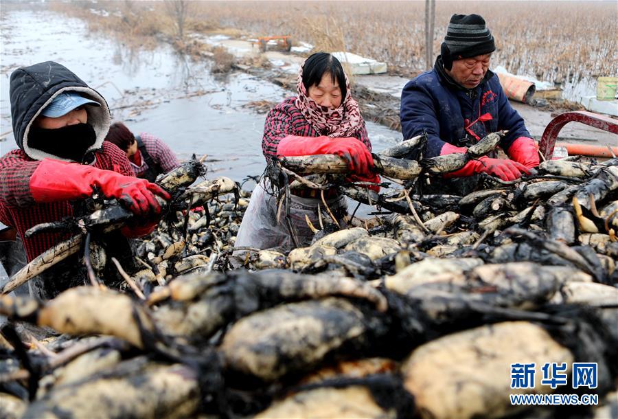 1月10日,村民在磁縣禾下土白蓮藕立體種養(yǎng)基地采收蓮藕。 新華社記者 王曉 攝