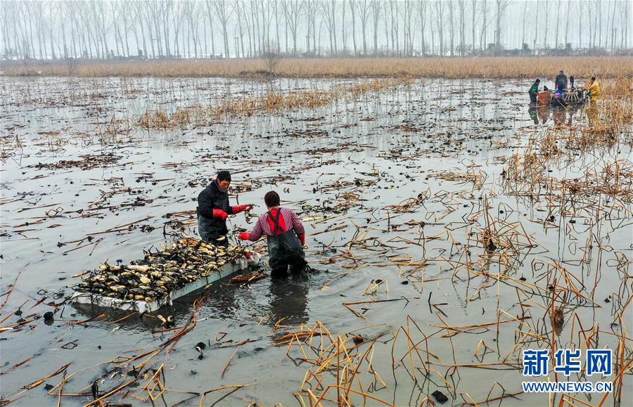 1月10日,村民在磁縣禾下土白蓮藕立體種養(yǎng)基地收獲蓮藕。 新華社記者 王曉 攝