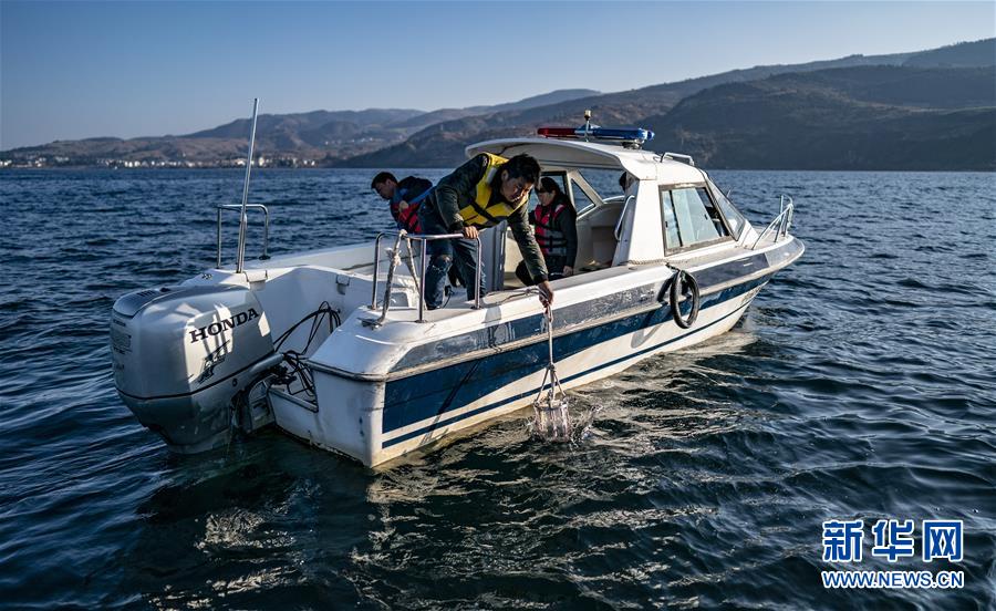 1月10日,云南省生態(tài)環(huán)境科學(xué)研究院的工作人員在撫仙湖取樣,進(jìn)行月度水質(zhì)監(jiān)測。 新華社記者 江文耀 攝