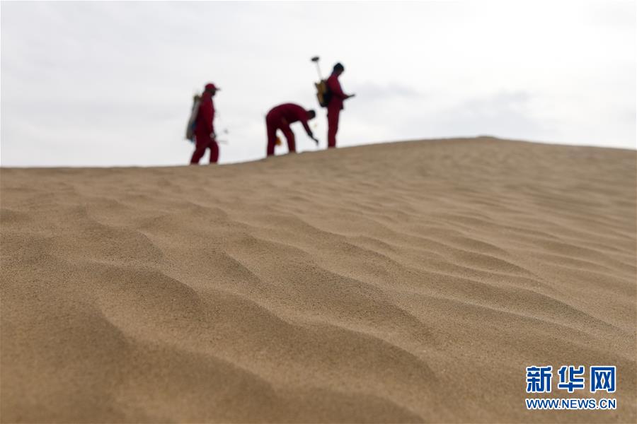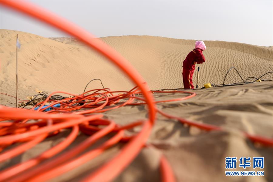 1月13日,測(cè)量工在測(cè)線上布設(shè)炮點(diǎn)樁號(hào)。地球物理勘探是油氣開(kāi)發(fā)的第一步,相當(dāng)于給地球做CT。物探工人按照嚴(yán)格的測(cè)線部署,在相應(yīng)位置鉆井,然后實(shí)施地震,采集地震波數(shù)據(jù)。科研人員通過(guò)數(shù)據(jù)組成的“CT片”,就能夠清晰地“看”到地下的地質(zhì)結(jié)構(gòu),判斷哪里埋藏有石油或者天然氣。2019年10月,東方地球物理勘探有限責(zé)任公司塔里木物探處2113隊(duì)進(jìn)入新疆塔克拉瑪干沙漠腹地,開(kāi)始中古14-21、塔中2兩個(gè)區(qū)塊的三維地震勘探。近2000名物探工人將在1000平方公里的范圍內(nèi)一直工作到2020年4月,這也意味著他們將在塔克拉瑪干沙漠腹地連續(xù)度過(guò)第14個(gè)除夕夜。蘊(yùn)藏著豐富石油天然氣資源的新疆塔克拉瑪干沙漠有“死亡之?!敝Q,氣候干燥,年降水量在50毫米以下,冬季地表最低溫度超過(guò)零下30攝氏度,是世界油氣勘探難度最大的地區(qū)之一。為避開(kāi)風(fēng)季,物探工人每年9、10月份進(jìn)入沙漠,一直工作到來(lái)年4月,夜以繼日與黃沙、嚴(yán)寒為伴,用辛勤的汗水,為祖國(guó)找油找氣。新華社記者丁磊攝