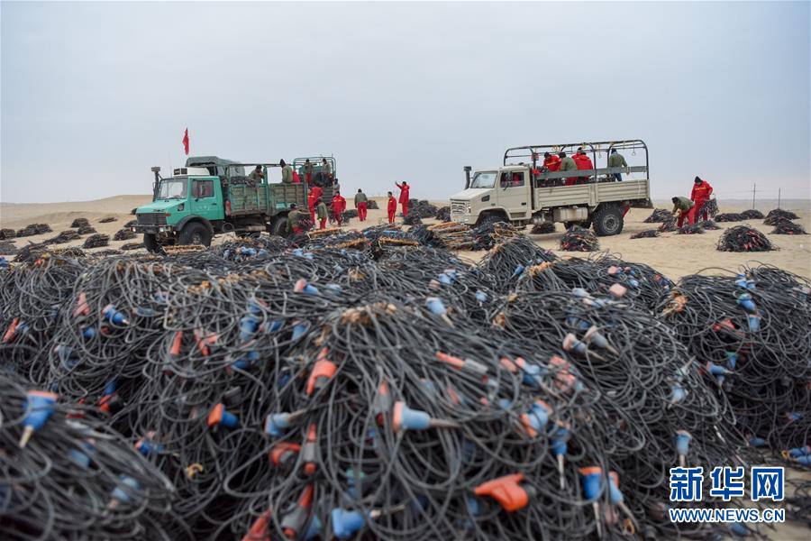 1月14日,放線工在出工前將一捆捆檢波器裝車(chē)。地球物理勘探是油氣開(kāi)發(fā)的第一步,相當(dāng)于給地球做CT。物探工人按照嚴(yán)格的測(cè)線部署,在相應(yīng)位置鉆井,然后實(shí)施地震,采集地震波數(shù)據(jù)。科研人員通過(guò)數(shù)據(jù)組成的“CT片”,就能夠清晰地“看”到地下的地質(zhì)結(jié)構(gòu),判斷哪里埋藏有石油或者天然氣。2019年10月,東方地球物理勘探有限責(zé)任公司塔里木物探處2113隊(duì)進(jìn)入新疆塔克拉瑪干沙漠腹地,開(kāi)始中古14-21、塔中2兩個(gè)區(qū)塊的三維地震勘探。近2000名物探工人將在1000平方公里的范圍內(nèi)一直工作到2020年4月,這也意味著他們將在塔克拉瑪干沙漠腹地連續(xù)度過(guò)第14個(gè)除夕夜。蘊(yùn)藏著豐富石油天然氣資源的新疆塔克拉瑪干沙漠有“死亡之?!敝Q,氣候干燥,年降水量在50毫米以下,冬季地表最低溫度超過(guò)零下30攝氏度,是世界油氣勘探難度最大的地區(qū)之一。為避開(kāi)風(fēng)季,物探工人每年9、10月份進(jìn)入沙漠,一直工作到來(lái)年4月,夜以繼日與黃沙、嚴(yán)寒為伴,用辛勤的汗水,為祖國(guó)找油找氣。新華社記者丁磊攝