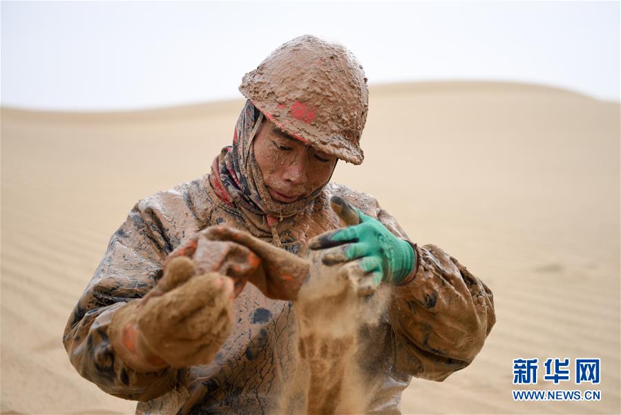1月13日,鉆井工潘洪星用沙子帶出手套里的泥水。地球物理勘探是油氣開(kāi)發(fā)的第一步,相當(dāng)于給地球做CT。物探工人按照嚴(yán)格的測(cè)線部署,在相應(yīng)位置鉆井,然后實(shí)施地震,采集地震波數(shù)據(jù)。科研人員通過(guò)數(shù)據(jù)組成的“CT片”,就能夠清晰地“看”到地下的地質(zhì)結(jié)構(gòu),判斷哪里埋藏有石油或者天然氣。2019年10月,東方地球物理勘探有限責(zé)任公司塔里木物探處2113隊(duì)進(jìn)入新疆塔克拉瑪干沙漠腹地,開(kāi)始中古14-21、塔中2兩個(gè)區(qū)塊的三維地震勘探。近2000名物探工人將在1000平方公里的范圍內(nèi)一直工作到2020年4月,這也意味著他們將在塔克拉瑪干沙漠腹地連續(xù)度過(guò)第14個(gè)除夕夜。蘊(yùn)藏著豐富石油天然氣資源的新疆塔克拉瑪干沙漠有“死亡之?!敝Q,氣候干燥,年降水量在50毫米以下,冬季地表最低溫度超過(guò)零下30攝氏度,是世界油氣勘探難度最大的地區(qū)之一。為避開(kāi)風(fēng)季,物探工人每年9、10月份進(jìn)入沙漠,一直工作到來(lái)年4月,夜以繼日與黃沙、嚴(yán)寒為伴,用辛勤的汗水,為祖國(guó)找油找氣。新華社記者丁磊攝