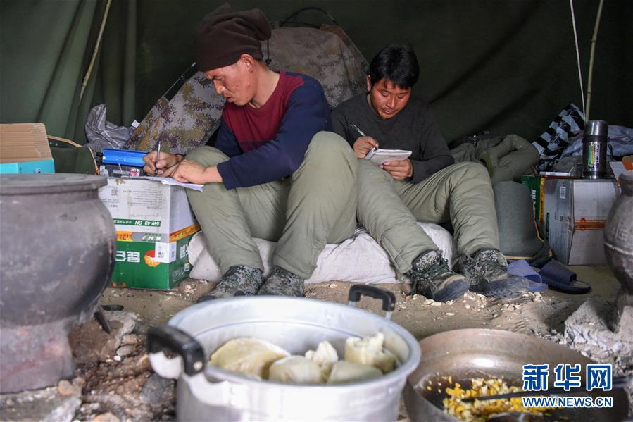 1月14日,查線工在吃飯間隙收聽(tīng)電臺(tái)里報(bào)出的不正常道樁號(hào),并記錄在本子上。地球物理勘探是油氣開(kāi)發(fā)的第一步,相當(dāng)于給地球做CT。物探工人按照嚴(yán)格的測(cè)線部署,在相應(yīng)位置鉆井,然后實(shí)施地震,采集地震波數(shù)據(jù)。科研人員通過(guò)數(shù)據(jù)組成的“CT片”,就能夠清晰地“看”到地下的地質(zhì)結(jié)構(gòu),判斷哪里埋藏有石油或者天然氣。2019年10月,東方地球物理勘探有限責(zé)任公司塔里木物探處2113隊(duì)進(jìn)入新疆塔克拉瑪干沙漠腹地,開(kāi)始中古14-21、塔中2兩個(gè)區(qū)塊的三維地震勘探。近2000名物探工人將在1000平方公里的范圍內(nèi)一直工作到2020年4月,這也意味著他們將在塔克拉瑪干沙漠腹地連續(xù)度過(guò)第14個(gè)除夕夜。蘊(yùn)藏著豐富石油天然氣資源的新疆塔克拉瑪干沙漠有“死亡之?!敝Q,氣候干燥,年降水量在50毫米以下,冬季地表最低溫度超過(guò)零下30攝氏度,是世界油氣勘探難度最大的地區(qū)之一。為避開(kāi)風(fēng)季,物探工人每年9、10月份進(jìn)入沙漠,一直工作到來(lái)年4月,夜以繼日與黃沙、嚴(yán)寒為伴,用辛勤的汗水,為祖國(guó)找油找氣。新華社記者丁磊攝