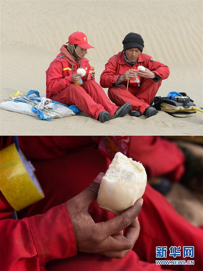 這是一張拼版圖片:上圖為測(cè)量工周?chē)?guó)燕(左)和丈夫杞朝金在沙漠中解決午餐(1月13日攝);下圖為測(cè)量工周?chē)?guó)燕在吃冰涼的饅頭(1月13日攝)。地球物理勘探是油氣開(kāi)發(fā)的第一步,相當(dāng)于給地球做CT。物探工人按照嚴(yán)格的測(cè)線部署,在相應(yīng)位置鉆井,然后實(shí)施地震,采集地震波數(shù)據(jù)??蒲腥藛T通過(guò)數(shù)據(jù)組成的“CT片”,就能夠清晰地“看”到地下的地質(zhì)結(jié)構(gòu),判斷哪里埋藏有石油或者天然氣。2019年10月,東方地球物理勘探有限責(zé)任公司塔里木物探處2113隊(duì)進(jìn)入新疆塔克拉瑪干沙漠腹地,開(kāi)始中古14-21、塔中2兩個(gè)區(qū)塊的三維地震勘探。近2000名物探工人將在1000平方公里的范圍內(nèi)一直工作到2020年4月,這也意味著他們將在塔克拉瑪干沙漠腹地連續(xù)度過(guò)第14個(gè)除夕夜。蘊(yùn)藏著豐富石油天然氣資源的新疆塔克拉瑪干沙漠有“死亡之海”之稱,氣候干燥,年降水量在50毫米以下,冬季地表最低溫度超過(guò)零下30攝氏度,是世界油氣勘探難度最大的地區(qū)之一。為避開(kāi)風(fēng)季,物探工人每年9、10月份進(jìn)入沙漠,一直工作到來(lái)年4月,夜以繼日與黃沙、嚴(yán)寒為伴,用辛勤的汗水,為祖國(guó)找油找氣。新華社記者丁磊攝