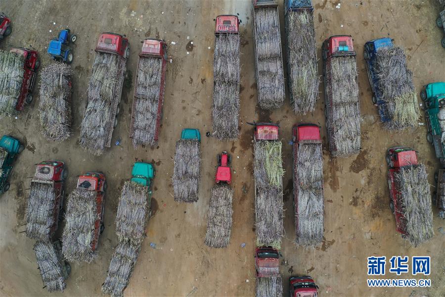 1月13日,運(yùn)蔗車輛排隊(duì)進(jìn)入鹿寨縣一家制糖企業(yè)(無人機(jī)照片)。新華社記者黃孝邦攝