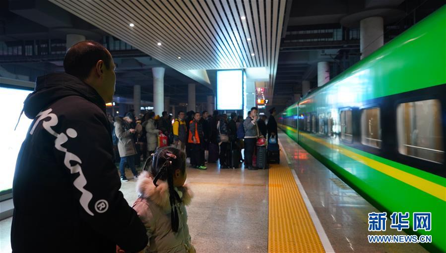 1月3日,卞菁值乘的動(dòng)車到站,朱梓芮(前右)和父親尋找卞菁的身影。新華社記者 胡晨歡 攝