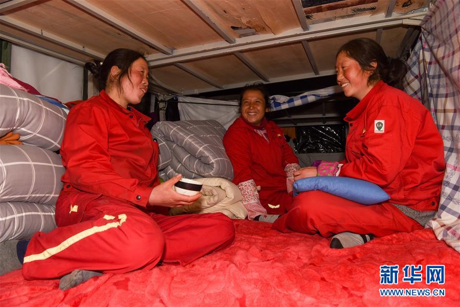 來自青海的放線工尚國(guó)青(中)三姐妹晚上在宿舍休息聊天(1月15日攝)。 新華社記者 丁磊 攝