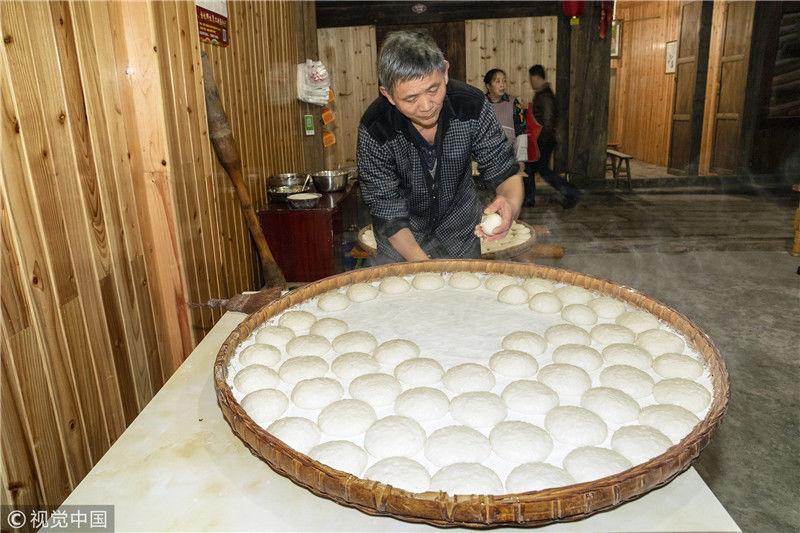 重慶江津區(qū)中山古鎮(zhèn)第十四屆 “千米長宴”民俗文化節(jié)盛大啟幕。上午10時,中山古鎮(zhèn)老街人聲鼎沸,窄窄的青石板路打掃得干干凈凈,家家戶戶門口掛起喜慶的紅燈籠,老商鋪門口擺滿了米酒、烤糍粑、煙熏豆腐……此次“千米長宴”以“絲路情緣,‘?!现猩健睘橹黝}?!扒组L宴”期間,游客們不僅可以一雙筷子吃遍全街,還可欣賞到祈福祭祀、民俗拜年、“打盆上菜”等表演,同時還增設(shè)了以唱、跳、講故事的上菜方式情景演繹愛情主題的文化餐飲,展示富硒愛情宴的文化內(nèi)涵。圖為街坊們在頭天就開始準備各種菜肴與小吃。