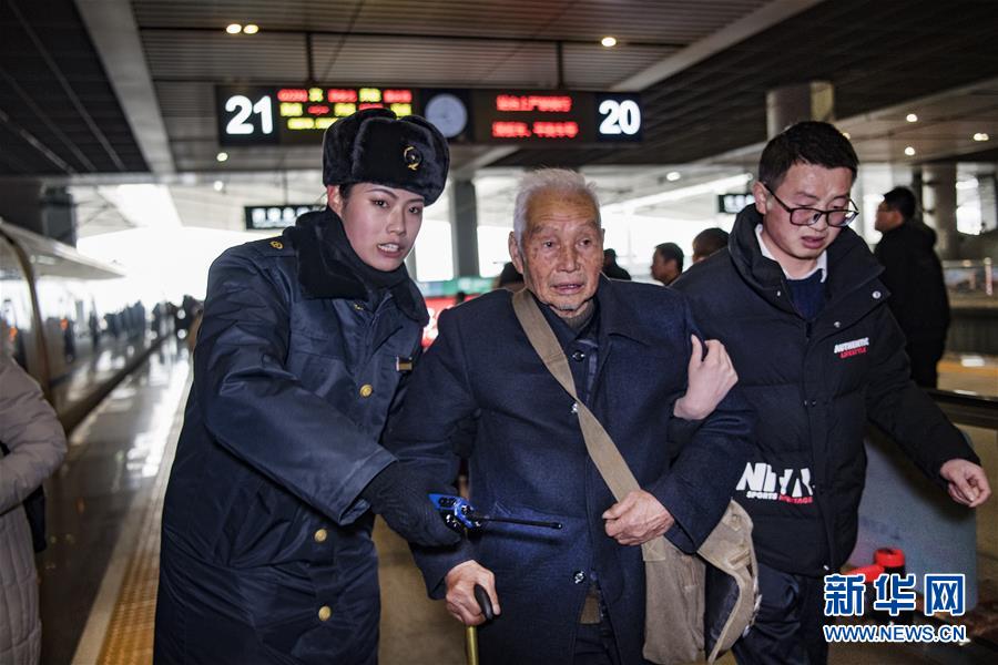 盲人姑娘吳瀟(左)從西安北站中轉(zhuǎn)回延安老家,得到吉如的溫馨服務(wù)。臨別時(shí),吳瀟激動(dòng)地說(shuō):“小姐姐,你的服務(wù)太貼心了,我看不見(jiàn)你,能摸摸你的臉頰嗎?”(1月15日攝)。新華社記者陶明攝