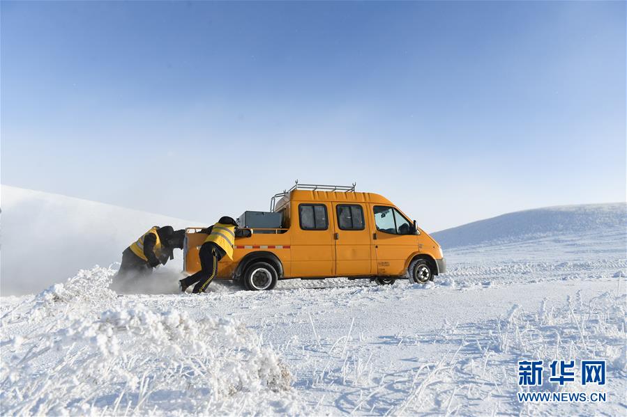 1月13日,車輛在途中打滑,白音庫(kù)倫綜合維修車間的職工推車前行。新華社記者劉磊攝