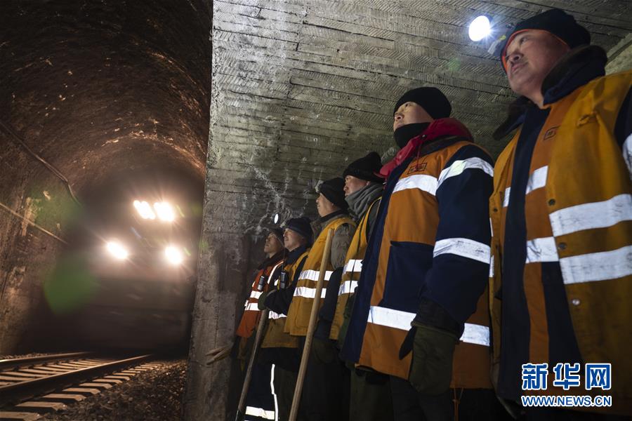 1月7日,在加格達(dá)奇工務(wù)段西羅奇嶺二號(hào)隧道,西羅奇維修工隊(duì)工作人員在避車洞內(nèi)躲避列車。新華社記者才揚(yáng)攝