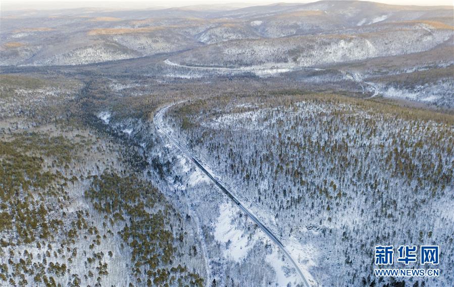 1月6日,一輛列車(chē)穿行在西羅奇維修工隊(duì)管區(qū)的林海雪原上(無(wú)人機(jī)照片)。新華社記者才揚(yáng)攝