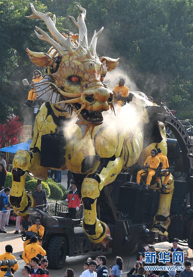 1月18日,大型機(jī)械裝置藝術(shù)品“龍馬精神”在珠海長隆海洋王國巡游展示。新華社記者 劉大偉 攝