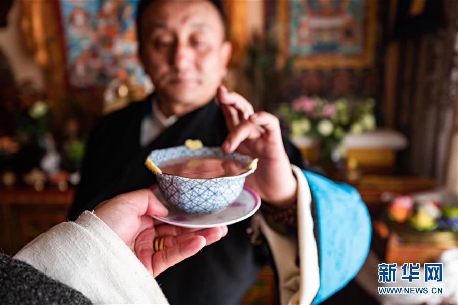 一名拉薩市民在進(jìn)行品嘗青稞酒前的儀式(2月24日攝)。 新華社記者 普布扎西 攝