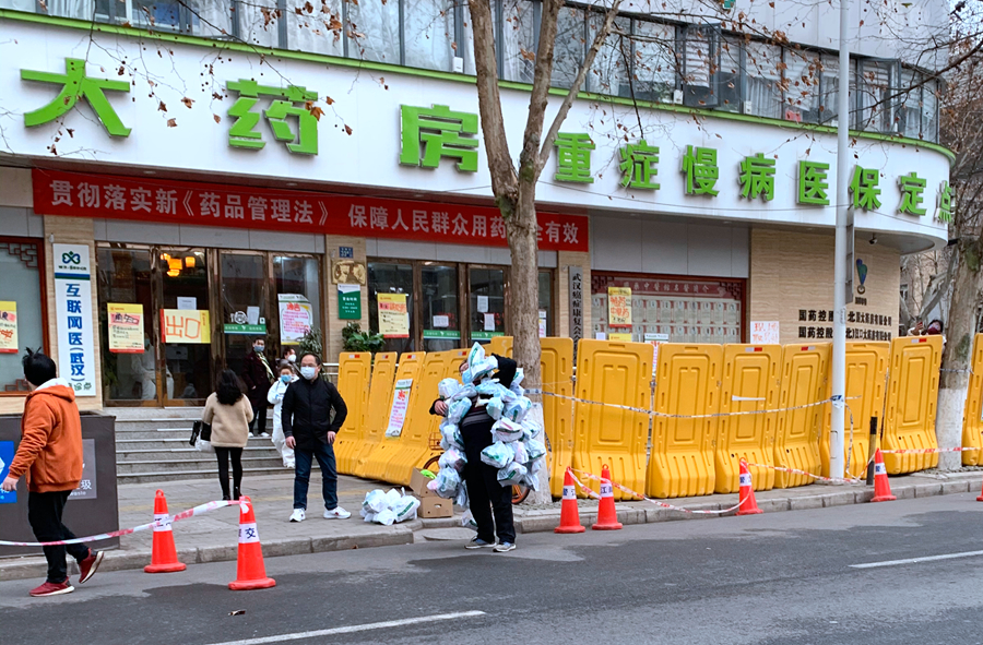 2月22日,王春波從藥店出發(fā),給周邊小區(qū)的居民送藥。新冠肺炎疫情防控工作啟動以來,在決戰(zhàn)之地武漢,有一群“平民英雄”默默付出鮮為人知。他們雖不是醫(yī)護(hù)人員,但也活躍在城市抗擊疫情的各個戰(zhàn)線上,力所能及地幫助他人,義無反顧的堅守自己的“戰(zhàn)場”,為抗擊疫情加油助力。近日,記者走近這群“平民英雄”,用鏡頭記錄下他們不平凡的身影。新華社記者熊琦攝