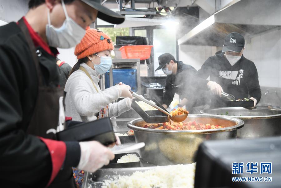 2月26日,劉女士(左二)和伙計(jì)們在分裝盒飯。新華社記者程敏攝