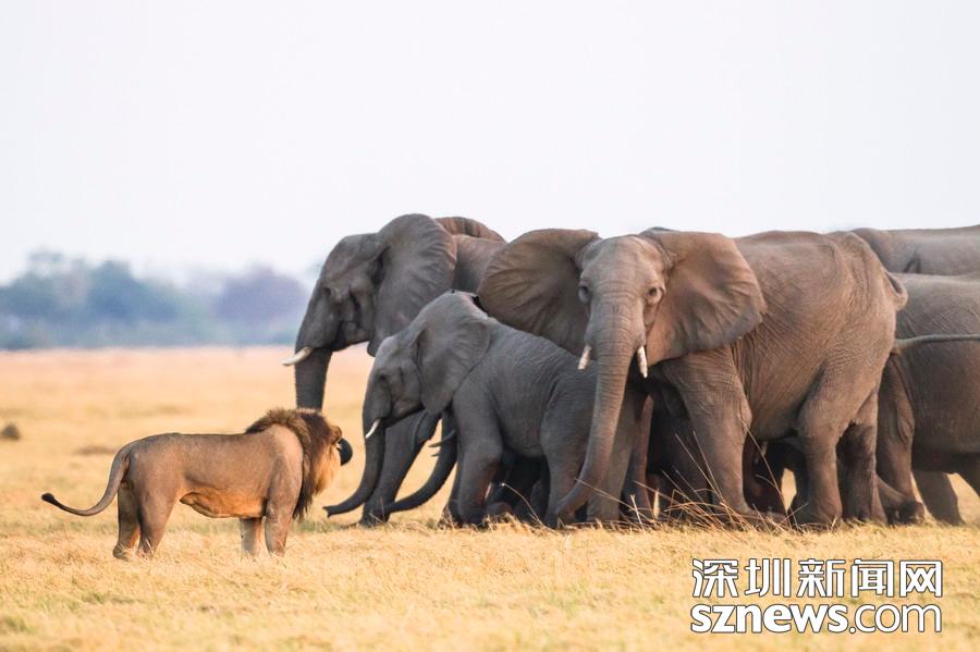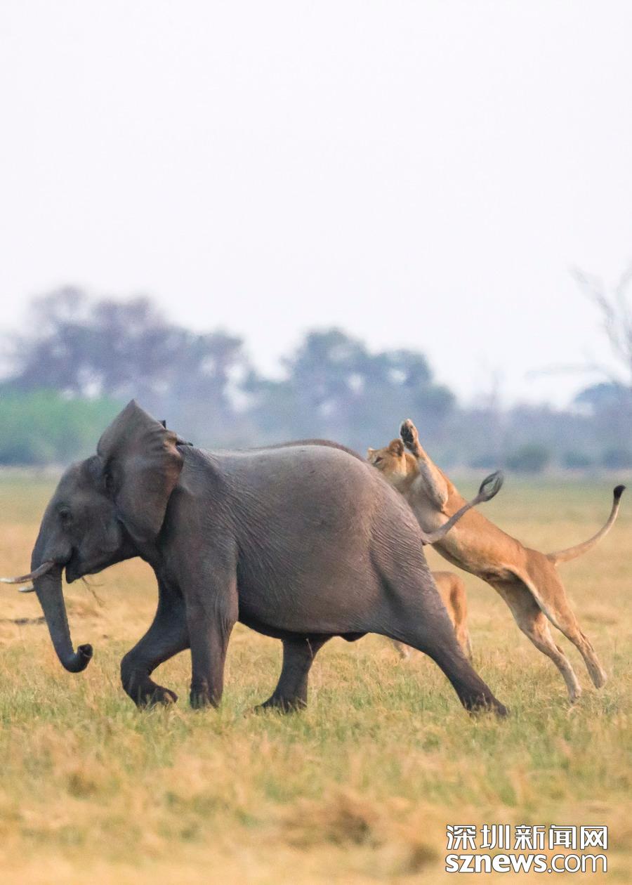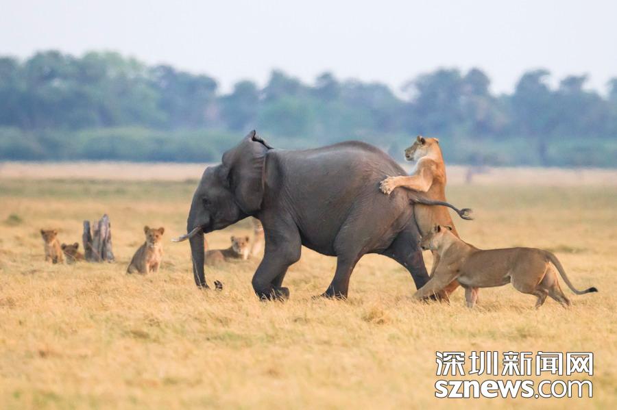 英國攝影師詹姆斯(James Gifford)在博茨瓦納喬貝國家公園拍到一群獅子獵食大象的精彩畫面。在詹姆斯的鏡頭下,一頭母獅跳到了一頭小象的背上想要將其拿下,但僅憑一己之力又不能做到。但當母獅的后援抵達時,象群也趕到了現場。最終,小象回到了象群中獲得庇護,而獅群也不得不悻悻離去。