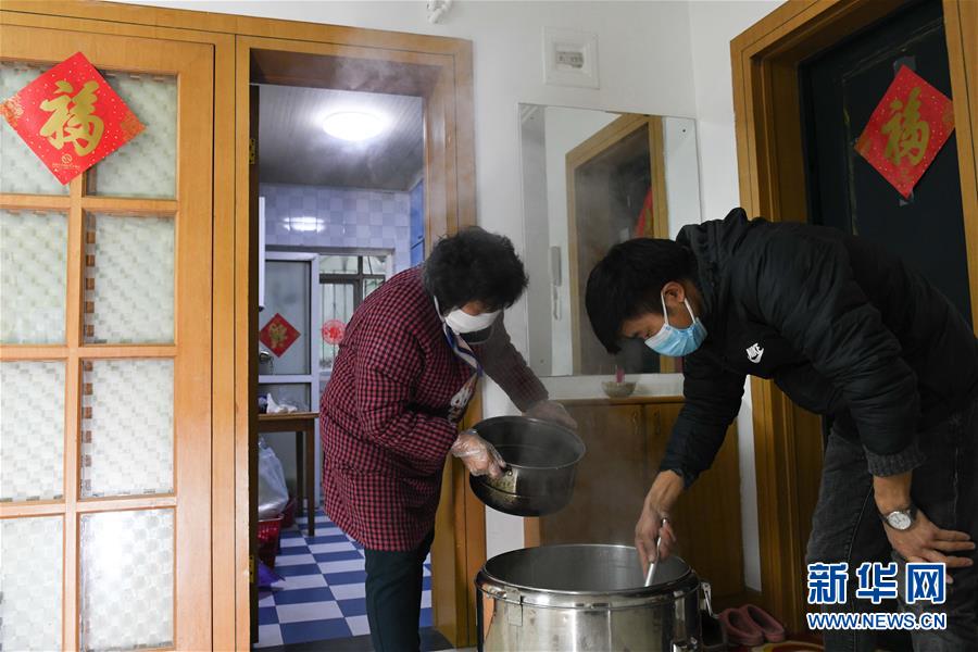 2月28日,張?zhí)m英將做好的粥倒入保溫桶,準備由兒子徐曉軍(右)送給疫情防控人員。新華社記者張端攝