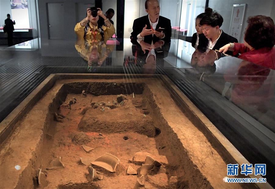 參觀者在二里頭夏都遺址博物館觀看展出的陶器(2019年10月19日攝)。新華社記者李安攝